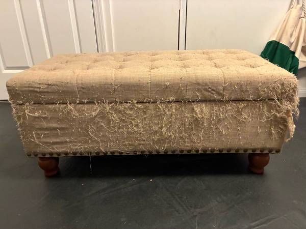 Beige tufted upholstered bed bench with storage. The bones are in great shape, but it’s been totally scratched up by my two cats. If you want a re-upholstering project, this may be the piece for you! Help me keep it from going in a landfill, please!