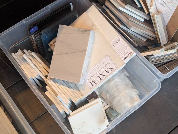 Free tile, stone, glass, & wood samples. Container not included. Located in Highland Park, 90042, near York Ave and Avenue 66. Send contact number so we can communicate via text.