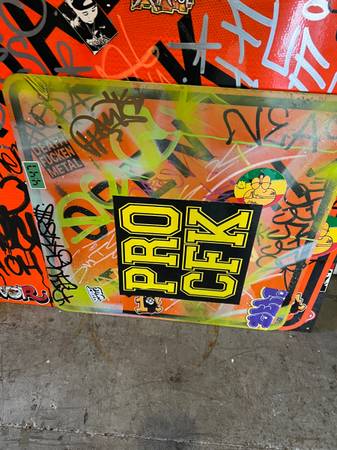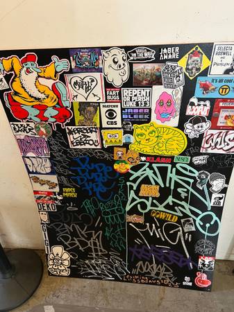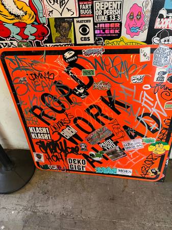 Two street signs and one poster board with street art and art stickers. Left over from a movie screening event.