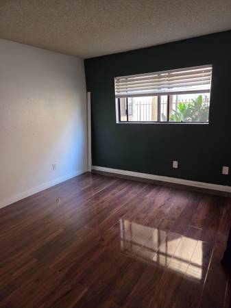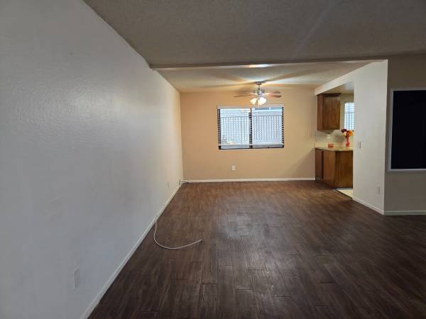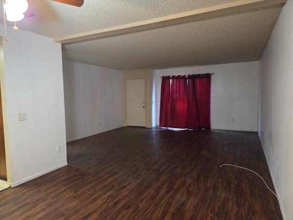 Laminate & vinyl floors, tiled bathrooms and kitchen, stainless steel gas stove & microwave , no A/C (you can bring a portable A/C). Video Available. Washer/Dryer hook-ups (Or provided, if needed)