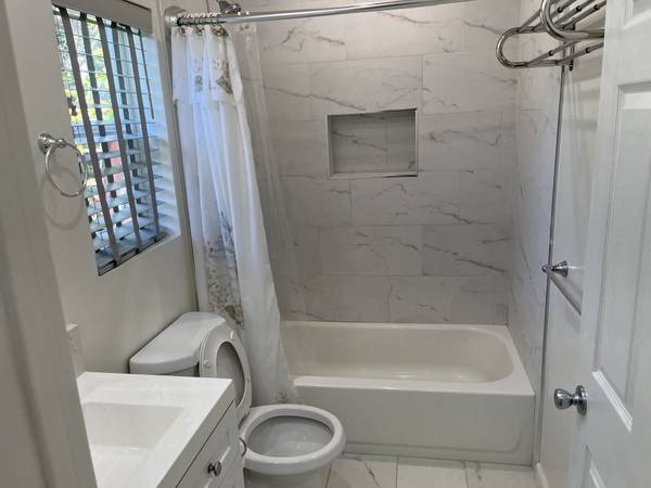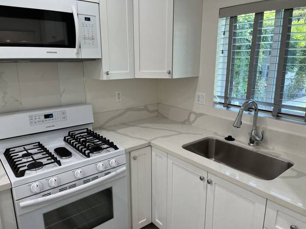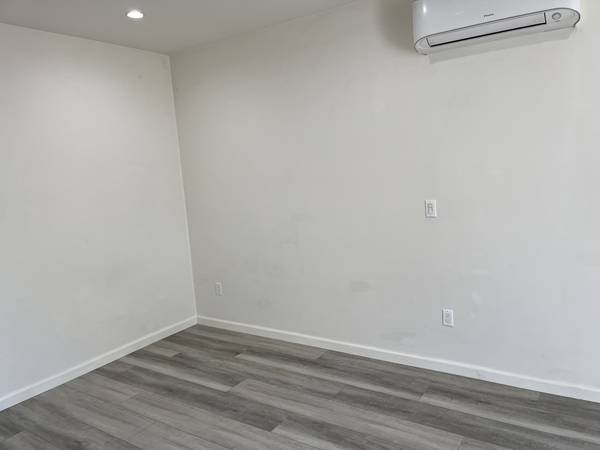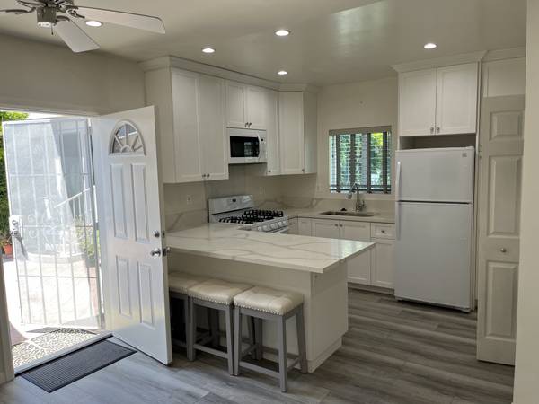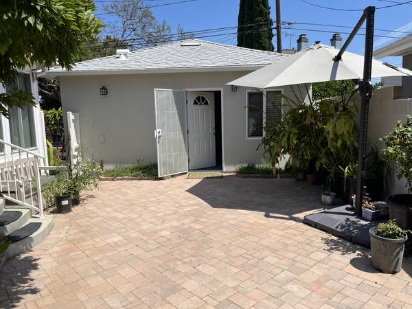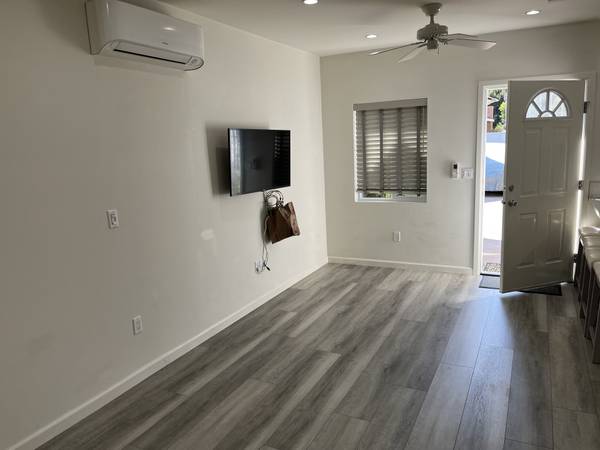 FOR LEASE: Beautiful Quiet Unfurnished Studio Apartment/ADU. Near Cal State Univ. Long Beach, 2 security gates. Includes TV set, quartz countertops, utilities (electric, water, gas, refuse, fiber optic wifi) Appliances include gas range, microwave, refrigerator/freezer, clothes washer & dryer, mini-split A/C & heat, tankless water heater), vinyl flooring, window blinds, many cabinets &; closet, ceiling fan, and landscaping/patio. Includes 4 padded stools. No pets. Easy freeway access. Parking on street. Owners live on property. 405 sqft + patio area.