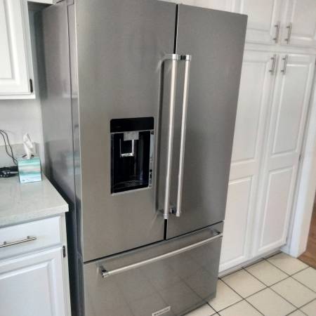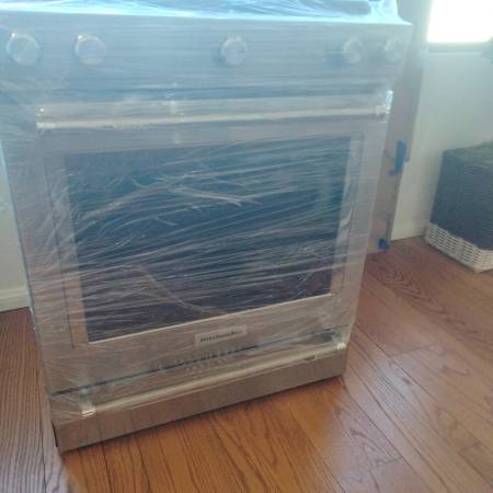 New never installed 30 in wide KitchenAid professional series slide in gas range convection bake with all the options over 2800 new have also matching microwave vent hood for above and matching KitchenAid French door refrigerator cabinet depth price separately