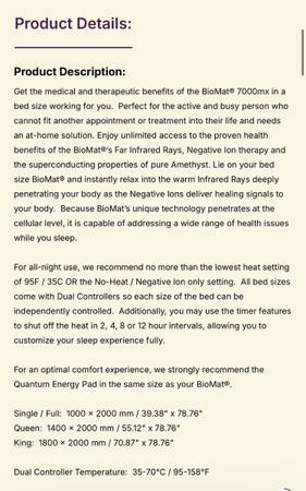 Original from BioMat brand. Perfect to put on top of a queen bed or on the floor. Great for spa treatments, massage, recovery, winter time and deep rest. Voltage: 120v Measurements: 55x78 inch...