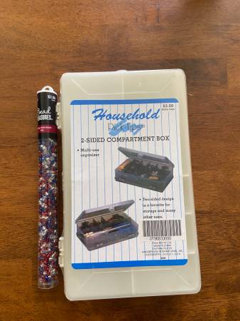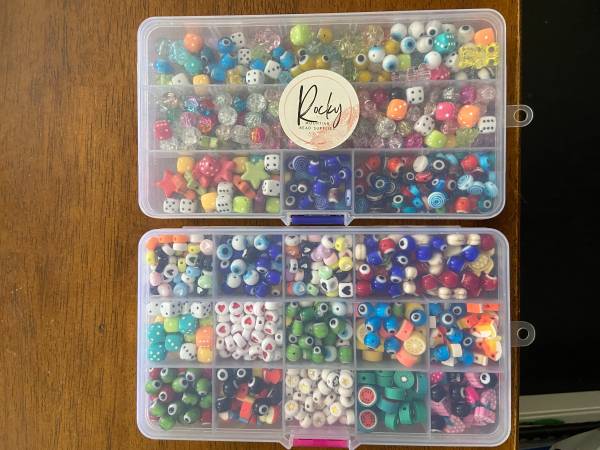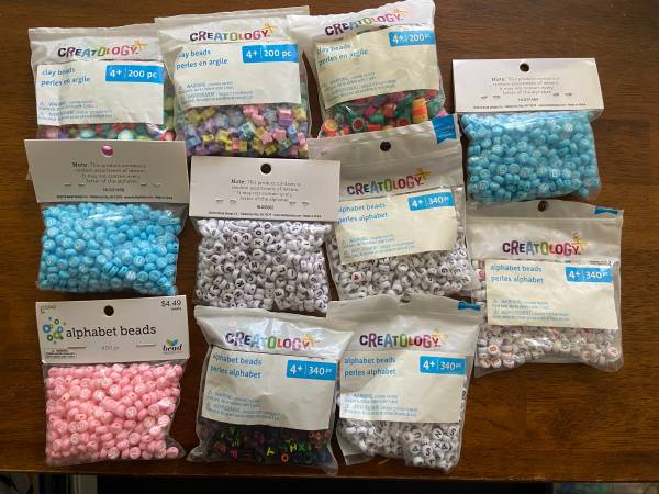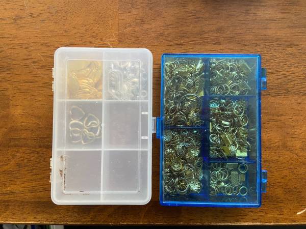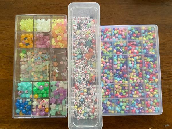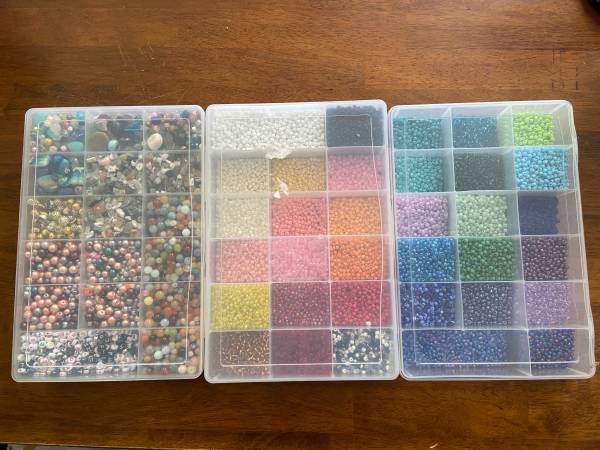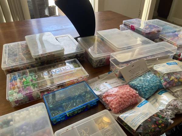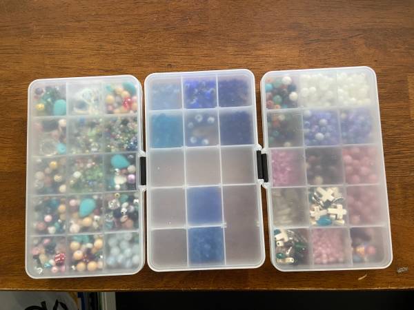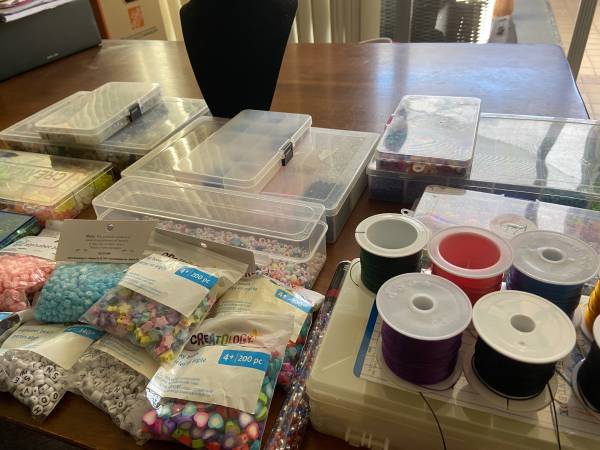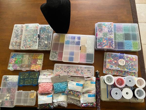 11 bags, 14 boxes (storage boxes included), 7 spools of elastic string, 1 bracelet and 1 necklace design board, 1 display stand. Everything for $50!