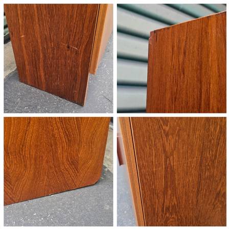 This is in good condition with some chips in the veneer that have been color matched, along with some light marks/scratches. The inside shelf is adjustable, however you would have to take off & put back on the doors to move it.