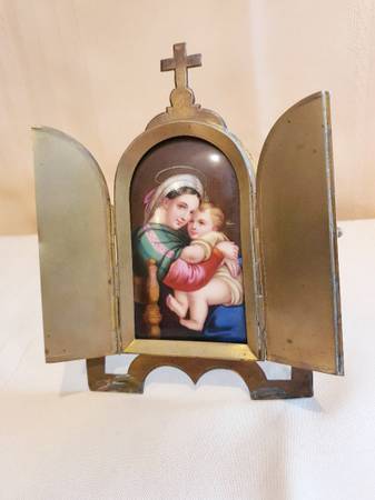 This is a very nice hand painted 19th century Madonna and Child on porcelain that comes in the original outstanding brass frame