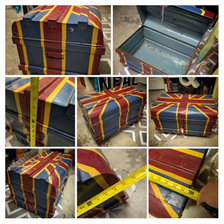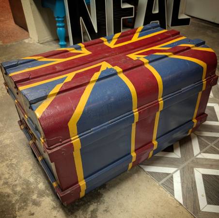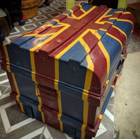 This is a very attractive piece, it is a 19th Century tin trunk, in very good used condition with a few small dents. It is hand painted outside with a large Union Jack.