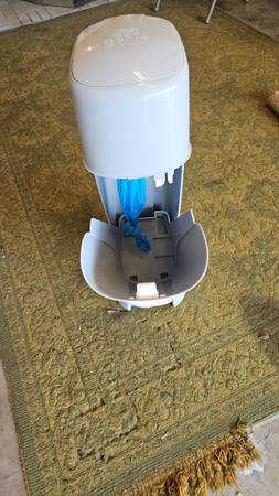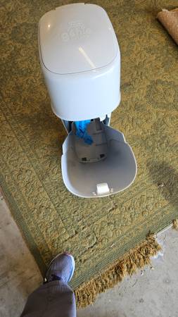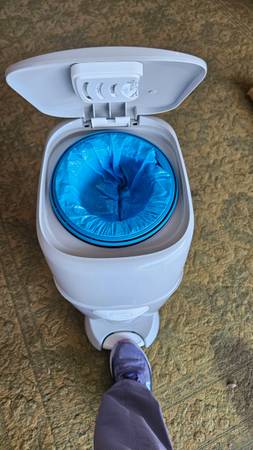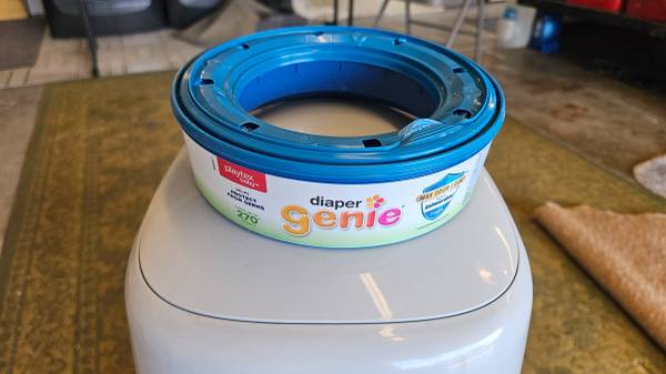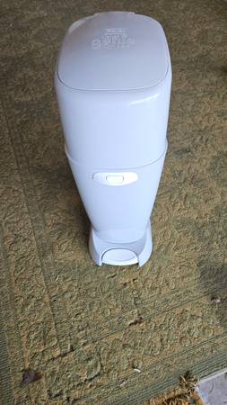 Playtex Genie Baby diaper disposal system. Foot pedal opens lid on top of canister to insert soiled diapers. Deodorizing carbon filter on lid. Few plastic bags included. Color - Gray. Cash Only.