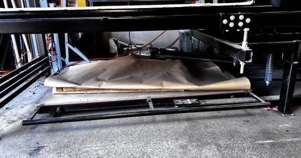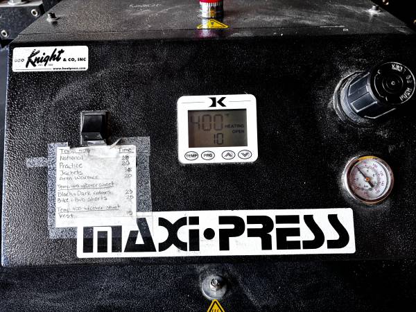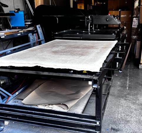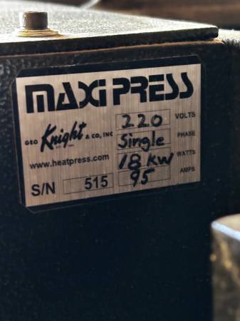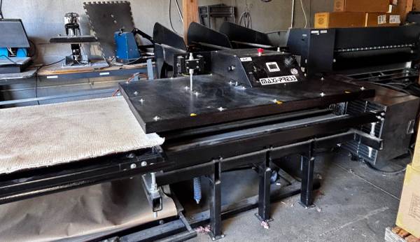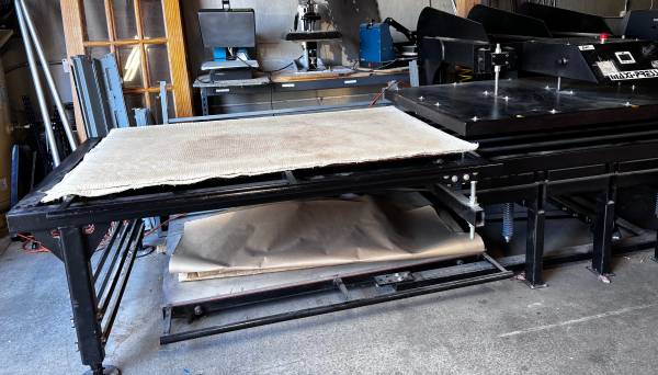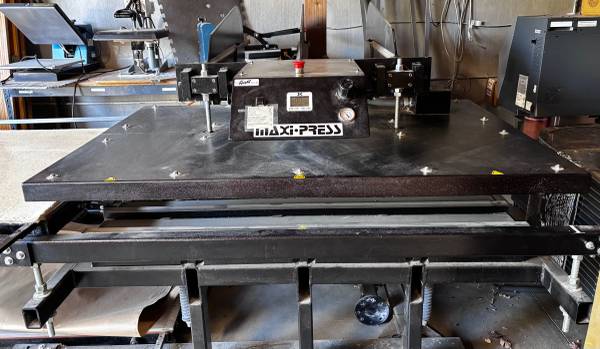 Selling a 2009 Geo Knight MaxiPress Air Twin 40” x 64” heat press paired with an Ingersoll Rand 2340 air compressor.