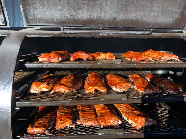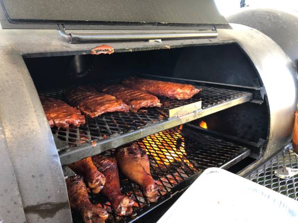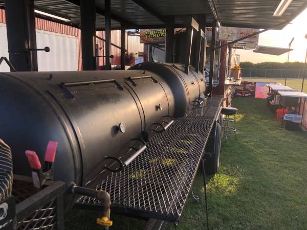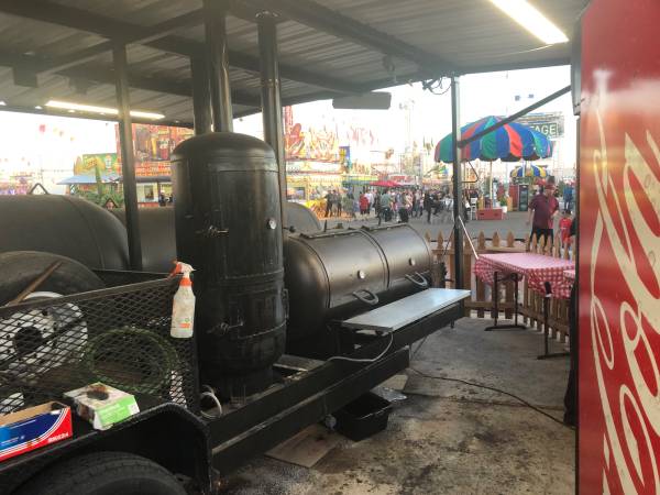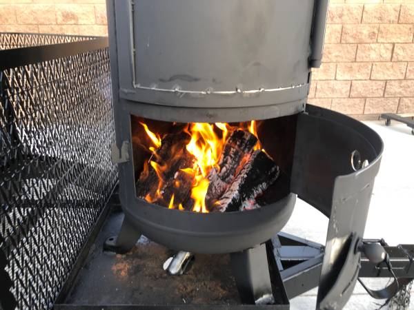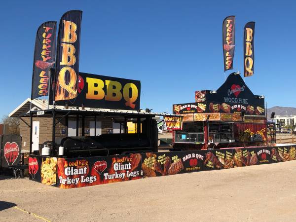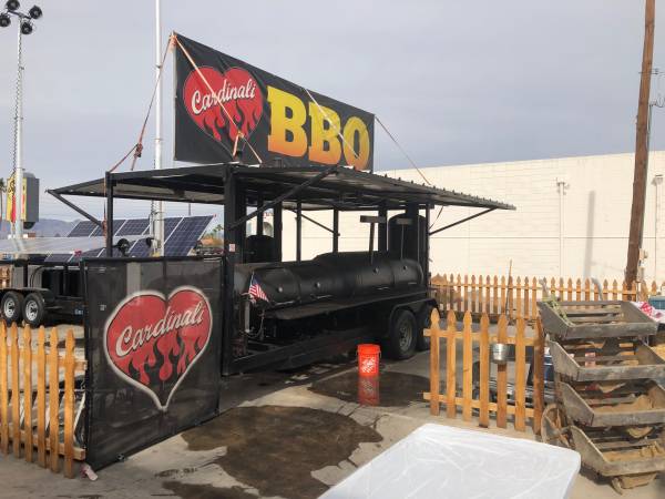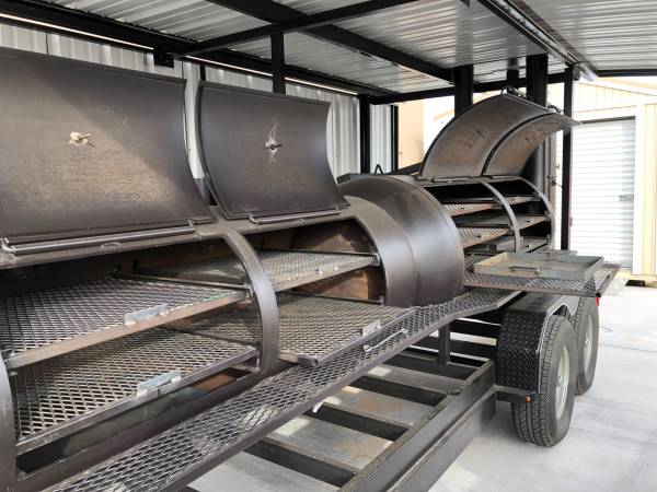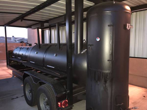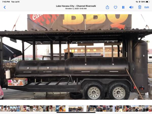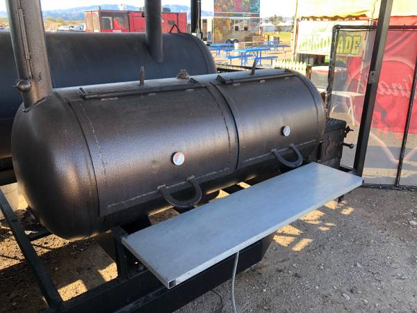 Giant smoker with retractable roof, holds 100s of pounds of meat, authentic stick burner with propane assist, multiple cooking chambers, wood basket, both horizontal, and vertical smokers reverse smoker , direct smoker large fire box all included in this beautiful smoker has 12000 lbs axles,14 ply tires with spare included, custom professionally built , cook, brisket, ribs, chicken, pork butt, sausage, turkey leg, hamburger, hotdog smoke, any meat, this is an eye catching barbecue smoker .selling magnet, used at fair and festival around the west coast makes a ton of money ez to operate. cost new over 28k selling for $15,000 or best offer located in Lake Havasu City, Az drive a little save a lot