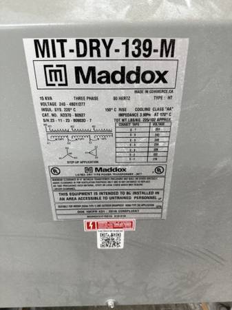 Bought in May 2024 as new. Maddox 15 kVA 3ph 240 D to 480 Y 277 (step up) Paid $1750 new. $1200 OBO Can provide receipt as needed.