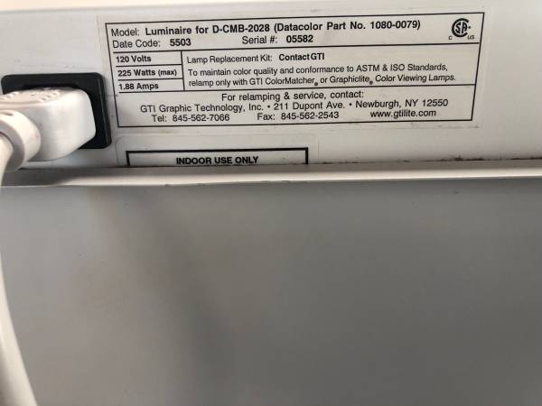 Selling a ColorMatcher with D65, CWF, Inc A, TL-83, & UV. Complete with GTI ColorGuard, push button “Instant On” lamp selector, and automatic light source sequencing. 19” high x 28” wide x 20” deep (48 x 71 x 51 cm) viewing area. Call or text me to (562)536-two five two zero for more information.