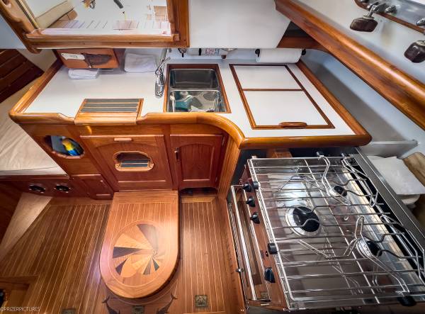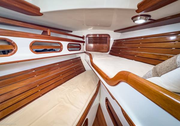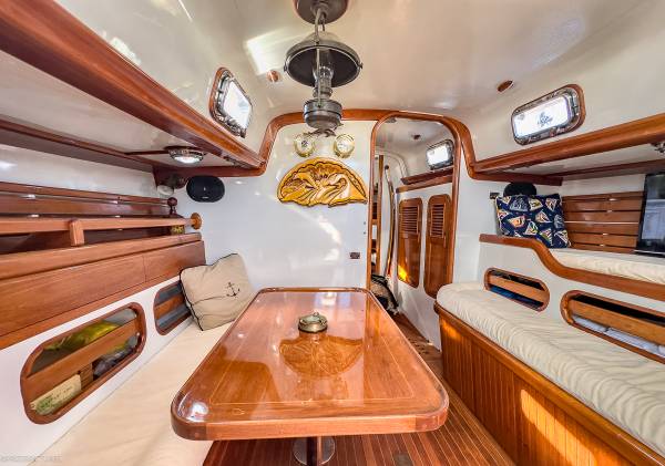 Warm and inviting, the cabin features handcrafted teak joinery, custom wood inlays, and excellent ventilation through stainless opening ports and hatches. The layout sleeps up to six in a quarter berth, salon settees, and a forward stateroom. The enclosed head is fitted with a Vacuflush freshwater toilet, vanity sink, and shower wand.