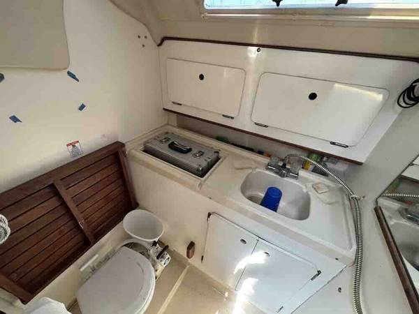 Impressively maintained, is clean inside and out, with low engine hours. Includes main and headsail, aluminum extrusion mast with double spreader, Harken MKI headsail fuller, lazy jack, Schaefer H-Tack traveler, four winches. Blue canvas dodger with isinglass, additional mainsail cover, and large canvas boat cover are also included. Also included (but not shown in photo) are the galley table and its support pedestal, and the cockpit collapsible table, and a butane BBQ that mounts to the rail.