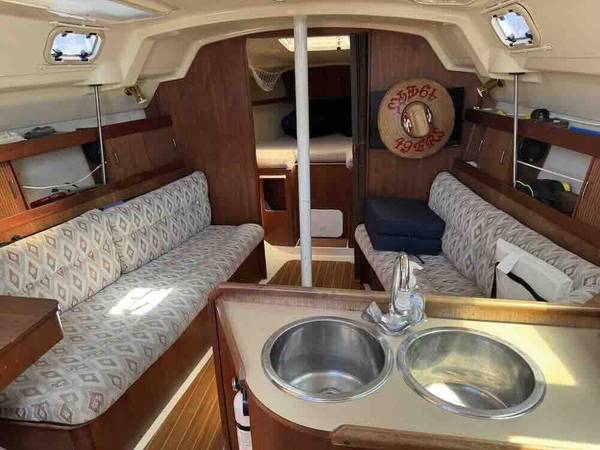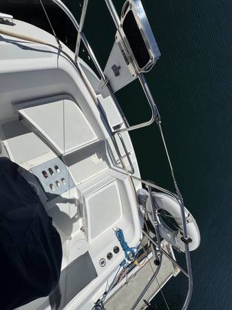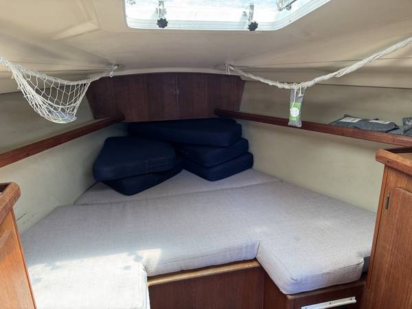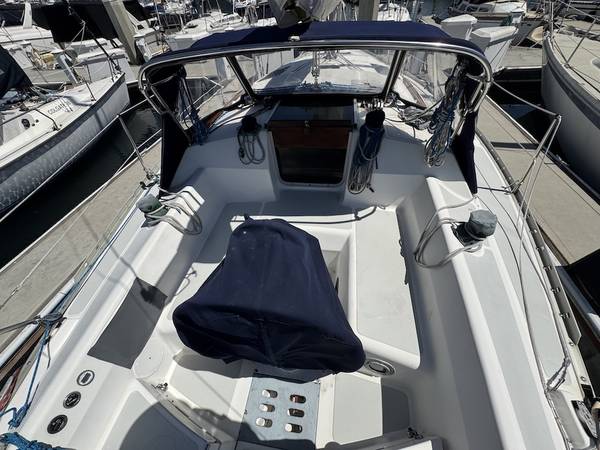 The Hunter 30-2, 1989 model is a refreshing improvement on most other 30' sailboats built in the late 80's and 90's. The walk-through transom, with improved convenience and safety, was initiated in the US by Hunter in the mid 90's. This improves accessibility to the cockpit both on land and at sea, particularly at Catalina Island getting on and off a dinghy. The fractional rig allows for easier and more efficient sailing. Almost all of your current sailboats are now using fraction rig sailplans. This is a must-see, particularly before you buy a Catalina 30.