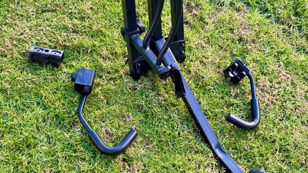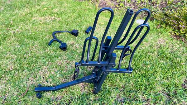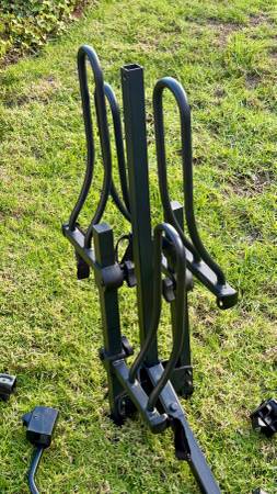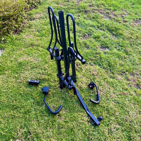 Hitch mounted bicycle rack that holds 2 analog pedal bikes, not e-bikes. In great shape and only used a couple times. It can be locked and comes with the adapter to mount onto both large and small...