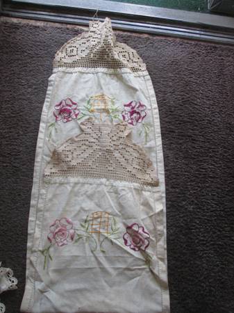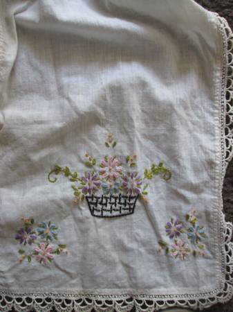(2) 1940's Vintage Embroidered Tablecloths with Lace Trim White tablecloth featuring floral embroidery and lace edging. There is damage to them. the white one has a hole in it, and the tan one which is 46" long - has some holes too. If you know how to mend or cut and sew - they can be saved but for $8 for both of them - its still good!!!