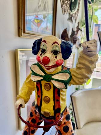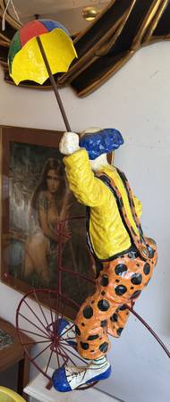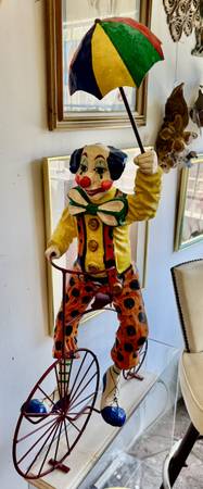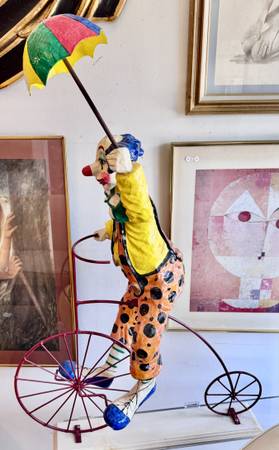 Paper Mache Clown Riding a Highwheeler. Good condition. Length: ~ 24” Depth: ~ 11” Total Height: ~ 38” Price: $150 CASH ONLY Please click on the 'more ads by this user' link to see other items I am...