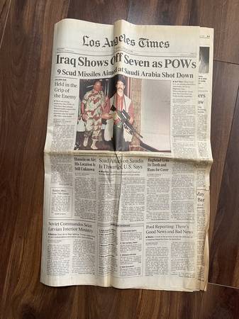 Los Angeles Times Newspaper, Monday, January 21, 1991, "Iraq shows Off Seven as POWs. 9 Scud Missles Aimed at Saudi Arabia Shot Down." Gen. Norman Schwarzkopf Cover Image. A Section Only. AAU-AM-NWS-GLF-4