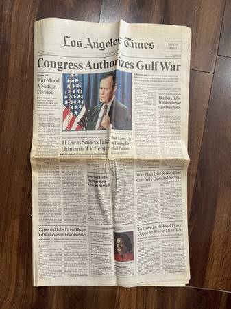 Los Angeles Times Newspaper, Sunday, January 13, 1991, "Congress Authorizes Gulf War." George Bush Cover Image. A Section Only. AAU-AM-NWS-GLF-1