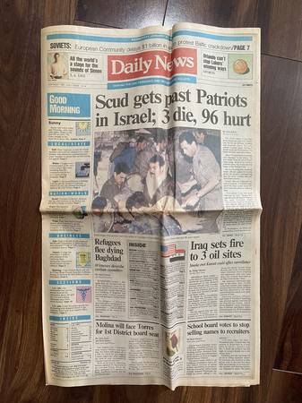 Daily News Newspaper, Wedneday, January 23, 1991. "Scud gets past Patriots in Israel; 3 die, 96 hurt." AAU-AM-NWS-GLF-6
