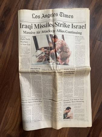 Los Angeles Times Newspaper, Friday, January 18, 1991, "Iraqi Missles Strike Israel. Massive Air Attacks by Allies Continuing." A Section Only. AAU-AM-NWS-GLF-3
