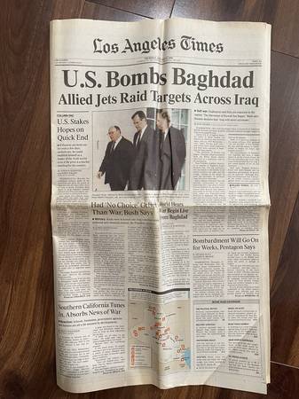 Los Angeles Times Newspaper, Thursday, January 17, 1991, "U.S. Bombs Baghdad. Allied Jets Raid Targets Across Iraq." A Section Only. AAU-AM-NWS-GLF-2
