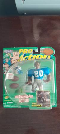 Brand new Starting Lineup Pro Action Barry Sanders figurine for sale. Packaging has some shelf wear. Cash only.
