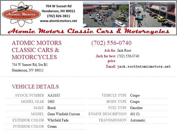 This vehicle is located at Atomic Motors Classic Car Sales and Restorations in Henderson, NV just 20 mins from the fabulous Las Vegas Strip. Come down and see us or call Jack for best price at 702-556-0740 or call our sales dept at 702-826-3811 ext 2 for general information. Additional pictures and videos may be found on our site at www.atomicmotors.net