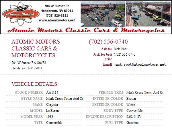 This vehicle is located at Atomic Motors Classic Car Sales and Restorations in Henderson, NV just 20 mins from the fabulous Las Vegas Strip. Come down and see us or call Jack for best price at 702-556-0740 or call our sales dept at 702-826-3811 ext 2 for general information. Additional pictures and videos may be found on our site at www.atomicmotors.net