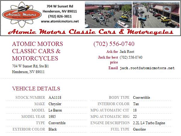 This vehicle is located at Atomic Motors Classic Car Sales and Restorations in Henderson, NV just 20 mins from the fabulous Las Vegas Strip. Come down and see us or call Jack for best price at 702-556-0740 or call our sales dept at 702-826-3811 ext 2 for general information. Additional pictures and videos may be found on our site at www.atomicmotors.net