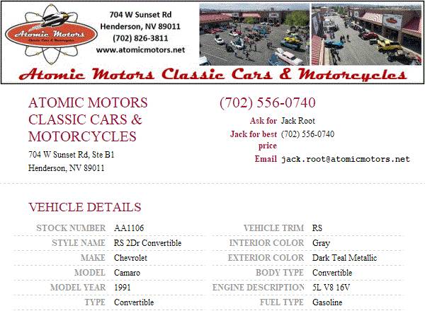 This vehicle is located at Atomic Motors Classic Car Sales and Restorations in Henderson, NV just 20 mins from the fabulous Las Vegas Strip. Come down and see us or call Jack for best price at 702-556-0740 or call our sales dept at 702-826-3811 ext 2 for general information. Additional pictures and videos may be found on our site at www.atomicmotors.net
