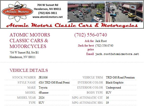DISCLAIMER: This site and all advertising information may be updated without notice whenever new information is obtained and may contain mistakes and inaccuracies. Information is provided to the best of our knowledge and that of the owners of the vehicles, and we make no warranty or representation regarding the accuracy, truth, or reliability of such information. We cannot be responsible for any errors, omissions, or inaccuracies contained in information provided by third parties. Atomic Motors is not an expert in the construction, engineering, finishes, materials, and componentry of every single vehicle we sell. It is the responsibility of the buyer to either inspect the vehicle personally or via a 3rd party, to ensure satisfaction to the condition and value, prior to purchase. Atomic Motors strives to perform extensive visual inspections on all vehicles we represent but we do not disassemble vehicles or components for inspection purposes and therefore it is always possible that there is hidden damage that is not readily apparent. All vehicles are sold AS-IS with no warranties expressed or implied.