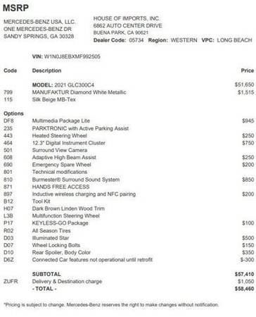 The following items have been reconditioned on this vehicle: new brakes and new pair of tires! * Designo Diamond White Metallic * Burmester ® Surround Sound System * 12.3" Digital Instrument Cluster * Panoramic Roof * Illuminated Star * Body Color Rear Spoiler * Adaptive Highbeam Assist * Heated Steering Wheel * Emergency Spare Wheel * Inductive Wireless Charging & Nfc Pairing * Wheel Locking Bolts * Hands-Free Access * Keyless Start * Rear Spoiler * Black Fabric Headliner * Dark Brown Linden Wood Trim * Silk Beige/Black; Mb-Tex Upholstery * Wheels: 19" 5-Spoke W/Grey AccentsThis vehicle includes a Money-Back Guarantee* and passed our precise inspection process. Best of all the price you see is the price you pay. No haggling. No back and forth. No pressure. And this price is so good it is guaranteed. *Money-Back Guarantee is valid for 5 days or 250 miles, whichever comes first. Subject to certain terms and conditions. See store for details. Some restrictions apply.The Mercedes-Benz GLC is the benchmark all other SUVs strive to meet. With exceptional power, towing and handling, this SUV can handle anything thrown at it. Comfort. Performance. Safety. Enjoy all three with this well-appointed AWD 2021 Mercedes-Benz. The look is unmistakably Mercedes-Benz, the smooth contours and cutting-edge technology of this Mercedes-Benz GLC GLC 300 will definitely turn heads. A truly breathtaking example of pure vehicle design achievement...this is the vehicle of your dreams!