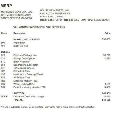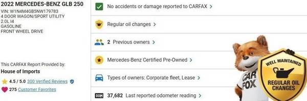 * Premium Package Lite * Garage Door Opener * Wheel Locking Bolts * Keyless Start * Rear Spoiler * Black Headliner * Black; Mb-Tex Upholstery * Night Black * Spiral Look Trim * Wheels: 7.5J X 18" Twin 5-SpokeThis vehicle includes a Money-Back Guarantee* and passed our precise inspection process. Best of all the price you see is the price you pay. No haggling. No back and forth. No pressure. And this price is so good it is guaranteed. *Money-Back Guarantee is valid for 5 days or 250 miles, whichever comes first. Subject to certain terms and conditions. See store for details. Some restrictions apply.This SUV is a superb example of what a tough, work focused vehicle should be. Exceptional towing, acceleration and torque will help you get the job done. You could spend more on fuel each month than on your vehicle payments, so why not consider one with exceptional fuel economy like this 2022 Mercedes-Benz GLB. Surprising quality accompanied by a high level of performance...this Night Black on Black Mercedes-Benz GLB GLB 250 could end up being the perfect match for you. Driven by many, but adored by more, the Mercedes-Benz GLB GLB 250 is a perfect addition to any home.