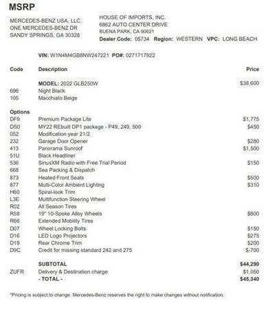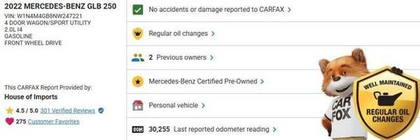 * Premium Package Lite * Panorama Roof * Wheels: 7.5J X 19" 10-Spoke W/Matte Black Accents * Panoramic Roof * Heated Front Seats * 64-Color Interior Ambient Lighting * Garage Door Opener * Led Logo Projectors * Rear Trim; Chrome * SiriusXM Radio * Wheel Locking Bolts * Keyless Start * Rear Spoiler * Black Headliner * Macchiato Beige; Mb-Tex Upholstery * Night Black * Spiral Look TrimThis vehicle includes a Money-Back Guarantee* and passed our precise inspection process. Best of all the price you see is the price you pay. No haggling. No back and forth. No pressure. And this price is so good it is guaranteed. *Money-Back Guarantee is valid for 5 days or 250 miles, whichever comes first. Subject to certain terms and conditions. See store for details. Some restrictions apply.This Mercedes-Benz GLB GLB 250 is an incredibly versatile vehicle that is a must have for any family. Why spend more money than you have to? This Mercedes-Benz GLB will help you keep the extra money you'd normally spend on gas. The Mercedes-Benz GLB GLB 250 will provide you with everything you have always wanted in a car -- Quality, Reliability, and Character. You can finally stop searching... You've found the one you've been looking for.
