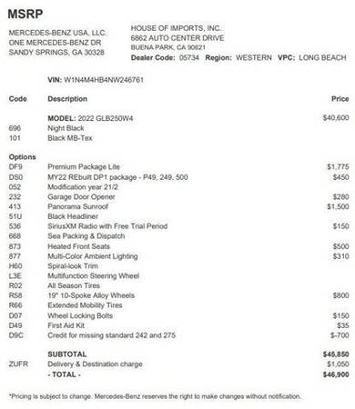* Premium Package Lite * Panorama Roof * Wheels: 7.5J X 19" 10-Spoke W/Matte Black Accents * Panoramic Roof * Heated Front Seats * 64-Color Interior Ambient Lighting * Garage Door Opener * SiriusXM Radio * Wheel Locking Bolts * Keyless Start * Rear Spoiler * First Aid Kit * Black Headliner * Black; Mb-Tex Upholstery * Night Black * Spiral Look TrimThis vehicle includes a Money-Back Guarantee* and passed our precise inspection process. Best of all the price you see is the price you pay. No haggling. No back and forth. No pressure. And this price is so good it is guaranteed. *Money-Back Guarantee is valid for 5 days or 250 miles, whichever comes first. Subject to certain terms and conditions. See store for details. Some restrictions apply.This Mercedes-Benz GLB GLB 250 is an incredibly versatile vehicle that is a must have for any family. No matter the weather conditions or terrain, this Polar White AWD Mercedes-Benz GLB GLB 250 handles with an elegant confidence. Fine interior appointments complement this vehicle's unprecedented performance. You've found the one you've been looking for. Your dream car. Just what you've been looking for. With quality in mind, this vehicle is the perfect addition to take home.