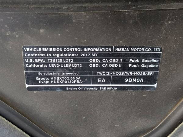 * [A92] Under Rail Bed Liner * [B92] Splash Guards * [L92] Floor Mats * [C03] 50 State Emissions * Graphite; Cloth Seat Trim * Magnetic BlackThis vehicle includes a Money-Back Guarantee* and passed our precise inspection process. Best of all the price you see is the price you pay. No haggling. No back and forth. No pressure. And this price is so good it is guaranteed. *Money-Back Guarantee is valid for 5 days or 250 miles, whichever comes first. Subject to certain terms and conditions. See store for details. Some restrictions apply.Thank you for visiting another one of We'll Buy Your Car Riverside's online listings! Please continue for more information on this 2017 Nissan Frontier SV with 42,242mi. It's not often you find just the vehicle you are looking for AND with low mileage. This is your chance to take home a pre-owned and barely driven Nissan Frontier. Based on the superb condition of this vehicle, along with the options and color, this Nissan Frontier SV is sure to sell fast. The look is unmistakably Nissan, the smooth contours and cutting-edge technology of this Nissan Frontier SV will definitely turn heads. The quintessential Nissan -- This Nissan Frontier SV speaks volumes about its owner, about uncompromising individuality, a passion for driving and standards far above the ordinary.