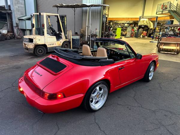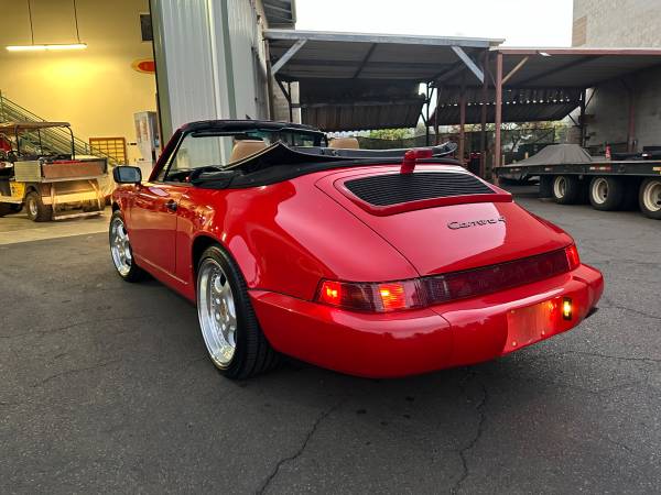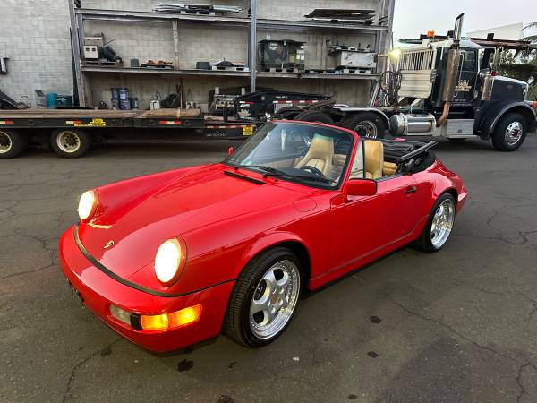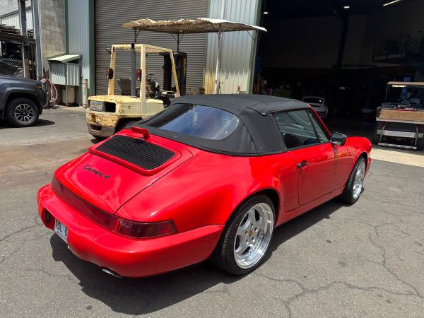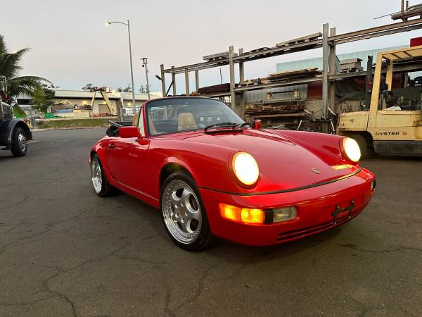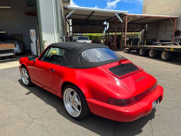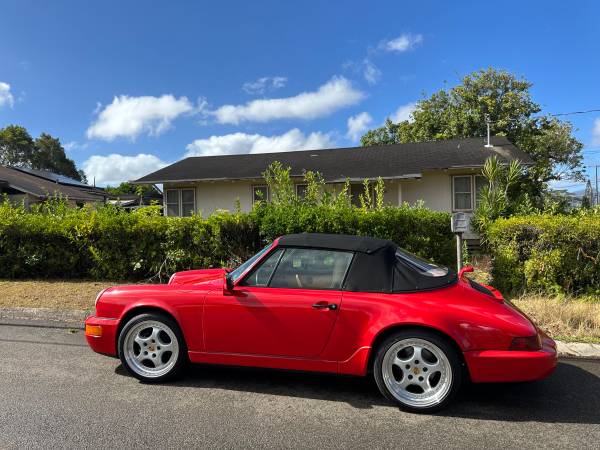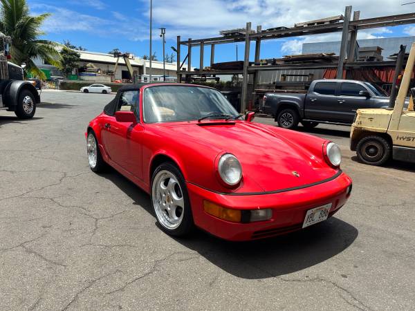 Porsche 1990 964 Carrera 4 Cabriolet. 5 speed manual. 90k mi Original guards red with beige interior. Zero rust! All panels are all rust free. Original CD-2 Player. Power operated black convertible top with new top from GAHH, reupholstered front seats covers by Classic 9 Leather. Not just recharged but New A/C fan motors, new evap. New aftermarket Speed Line 8 x 18 and 9.5 x 18 rim with Falken 225/40Z R18 and 255/35Z R18. Also included is the original wheels. New rear taillight and center light assembly. Purchase from the original female owner that took outstanding care for the car. No accidents. Never modified all stock. Drives incredibly smooth. Very tight and no squeaks or rattles. Car is in Honolulu. I will FOB Long Beach. $65,000. Brian 808 fiveninezero 9l44