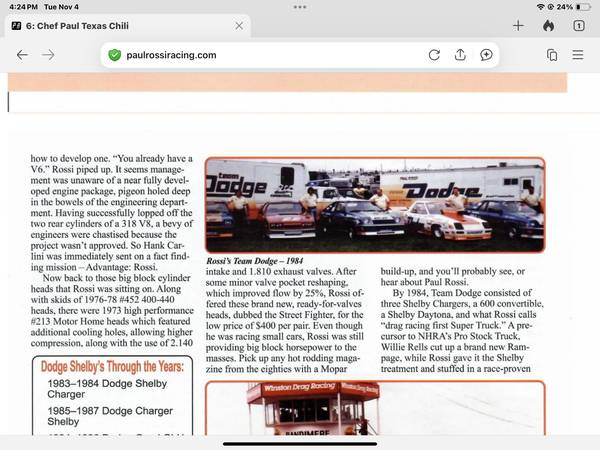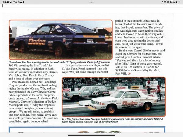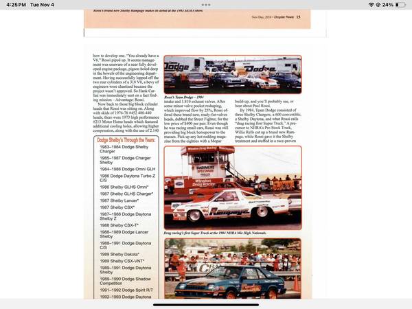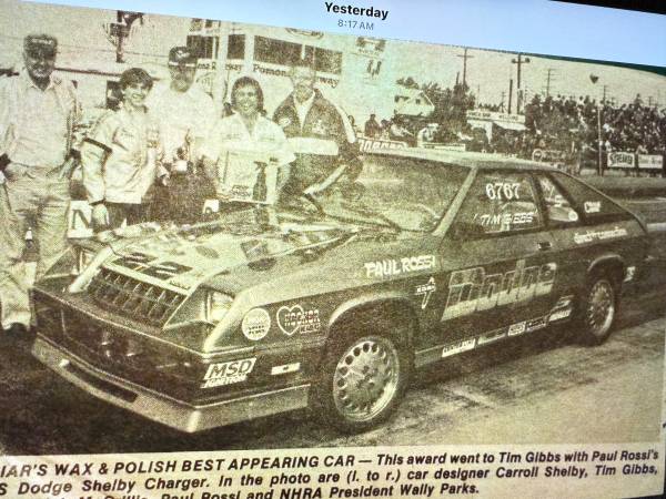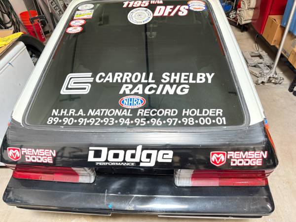 Quite possibly the rarest Carroll Shelby race car on the planet one of only three non- vin plate purpose race cars ever built ,one of only two survivors very rare collectible well documented national record holder ( the other 2 cars have not been located 2 were drag cars and one was a rally car ) in the early 80s Lee Iacocca who now headed up Dodge contacted Carroll Shelby, who was retired and convinced him into helping them build the new Dodge charger platform .Shelby then contacted factory Dodge racer Paul Rossi who campaign the car throughout the country promoting the Dodge brand. We have the actual factory Dodge How to make your charger into a race car ..brochure in perfect condition will be included in the sale.