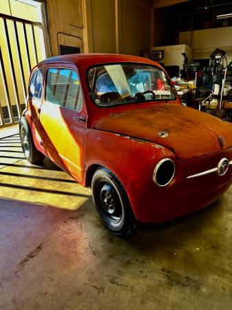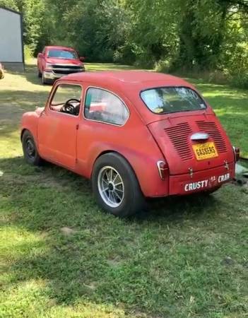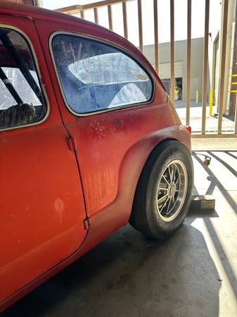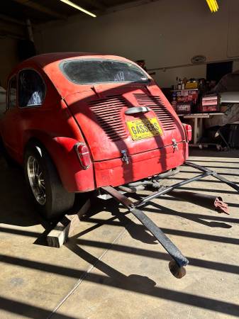 1958 Fiat 600 drag car. Was built for the South East Gasser Association 1/8 mile events. Complies with SEGA rules. Roll cage, new brakes and m/c. New IRS transmission. (No passes on it) Fresh 1914cc VW, ported VW heads, 44IDF carbs, built by gt66racing in Indiana Never had a full pass- needs axles.