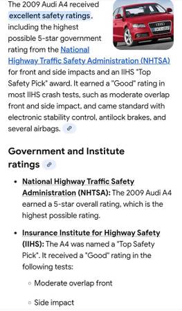 ⭐⭐⭐⭐⭐ The 2009 A4 received a 5 STAR Safety Rating, the highest rating that can be earned.