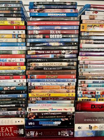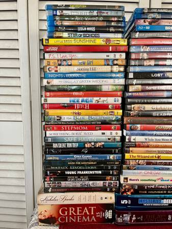 Large mixed lot of over 100 DVDs and Blu-Ray movies, featuring a wide variety of genres and popular titles. Most discs are in very good to excellent used condition. Several are brand new and factory sealed. Prices vary. Bundle multiple for best pricing. $100 includes everything pictured. Kept in home with no smokers or pets. Local meetup only. Cash, PayPal, Venmo, and Zelle accepted.
