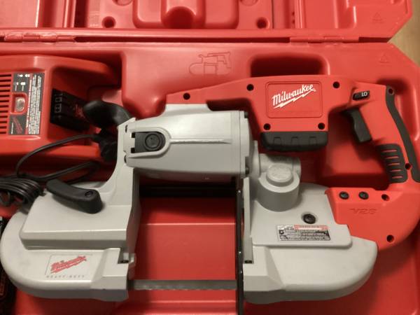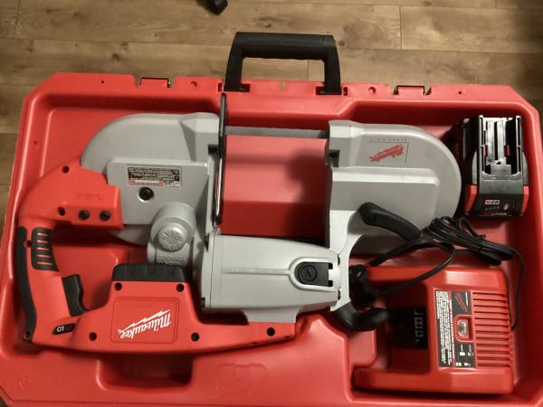 Milwaukee 28 Volt cordless deep cut bandsaw with factory manual and plastic carrying case comes with already installed blade and comes with charger 28 Volt. Brand new used one time great condition Battery is full charger.model number 0729–20 like brand new