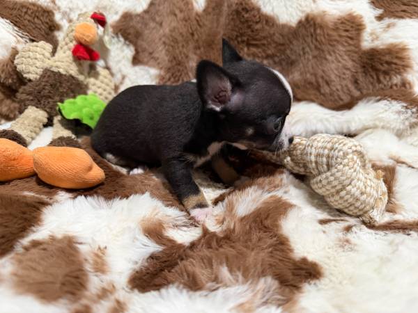 Male and Female Purebred Chihuahuas born on 11/17/25. Very Sweet and Playful friends. Male- Black and White $500 Female- Brown Merle $650 Ready by 12/6/25. Pick up or local delivery is available.