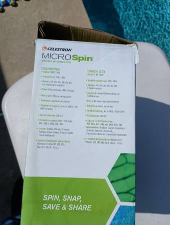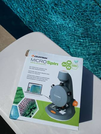 Celestron micro spin digital microscope used excellent condition comes with software cord. Missing the slides and the tweezers but for a classroom or existing science person great by $90 retail at...