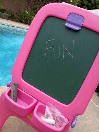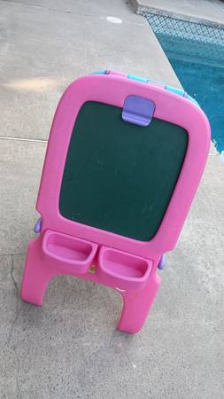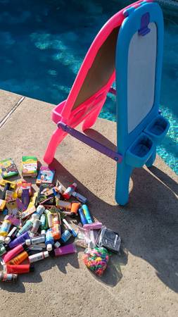 Crayola chalkboard easel with dries and magnetic letters folds up for easy storage. Also has clips to cook paper or cardboard for drawing or artwork great item removable trays. Tons of art supplies crayons chalk acrylic paint stickers everything for 20 bucks
