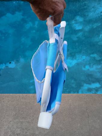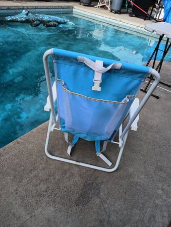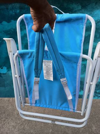 Folding blue picture like new has nylon carry handle also has straps to wear like a backpack and also has storage compartment to the rear of the chair so you could put your towel or your trunks in...