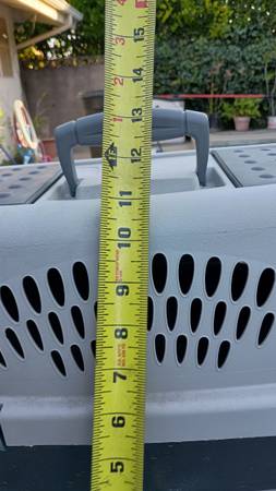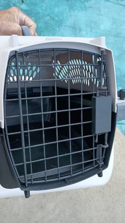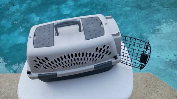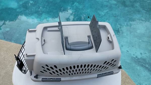 Plastic pet carrier small single door super excellent condition no issues. How's little compartments for snacks. The two clamshell have come apart for easy storage when not using. 19x12x11 inches