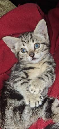 Sweet, playful 8 week dark striped female kitten, Needs a home. Ready to adopt, sleeps on top or next to warm people and pets or on soft blankets! Cuddler!
